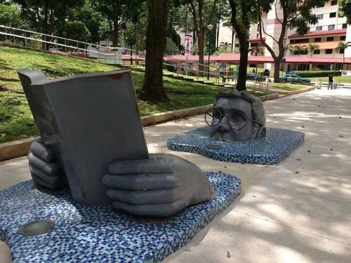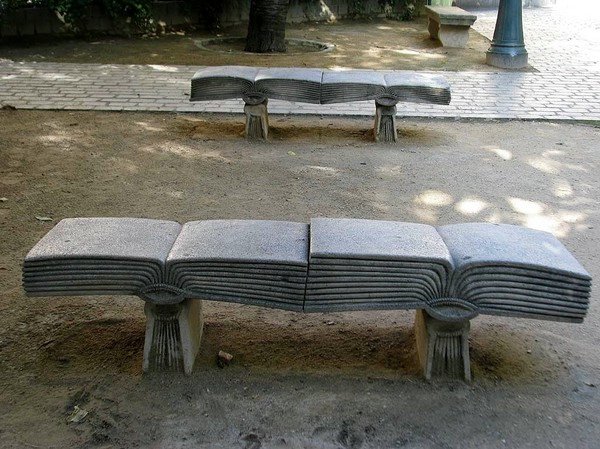 Скамья часто выступает в качестве самостоятельного элемента памятника. Однако в данных скульптурах автор сделал места для отдыха в виде книг с открытыми страницами. Отличное место для чтения!