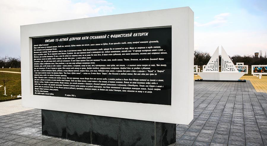 На входе в комплекс расположен памятник в виде скульптуры худенькой девочки, поднявшей руки к небу. Вокруг нее – красные камушки, а сзади дорожка из гранита. Все это символизирует потоки крови, пролившиеся в этом месте.
