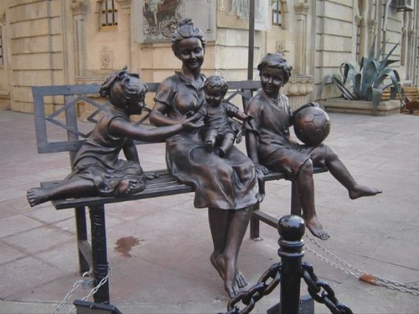 Прекрасная сцена, в которой старшие дети помогают маме справляться с малышом, запечатлена в бронзовом монументе на одной из улиц города Баку.